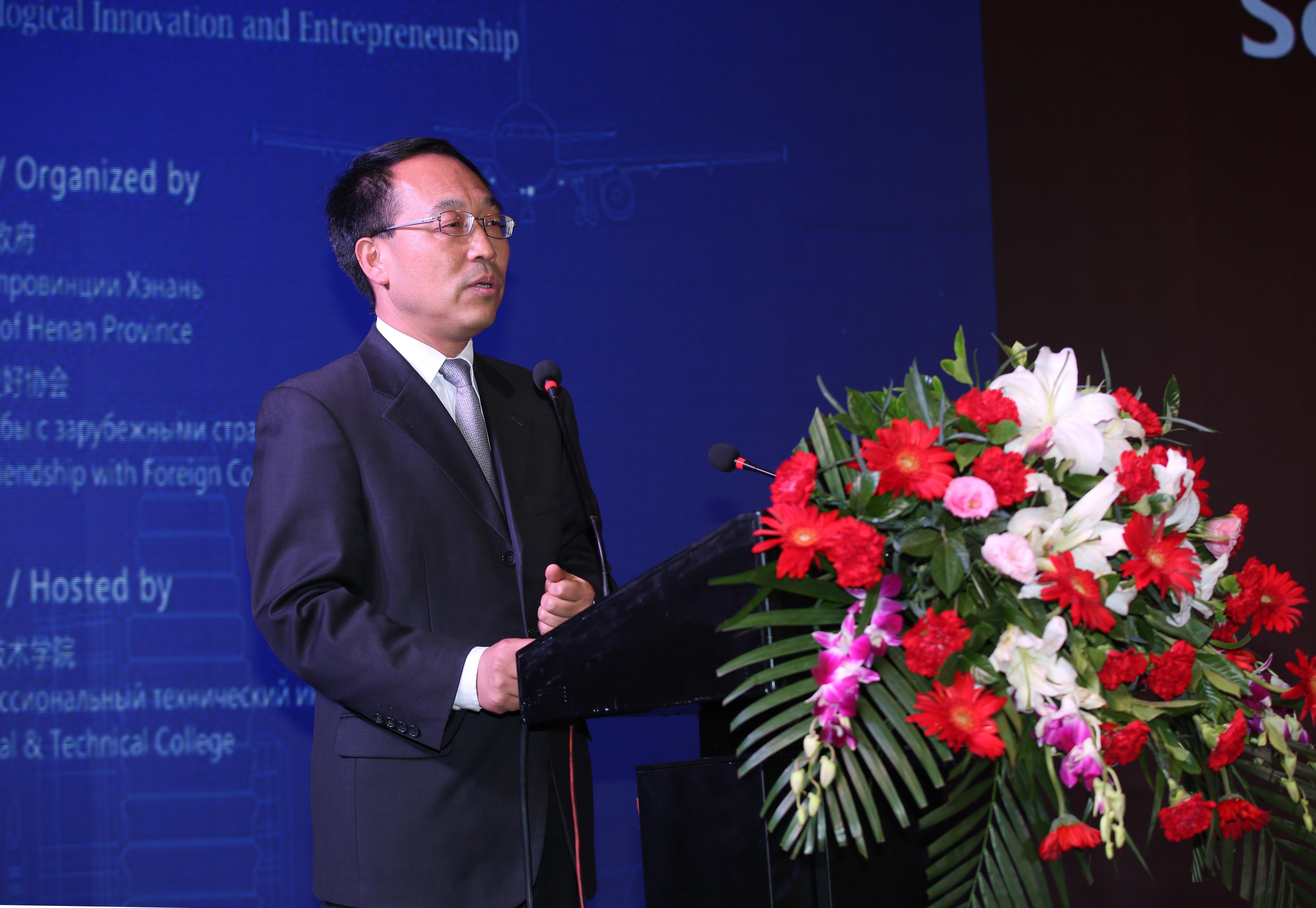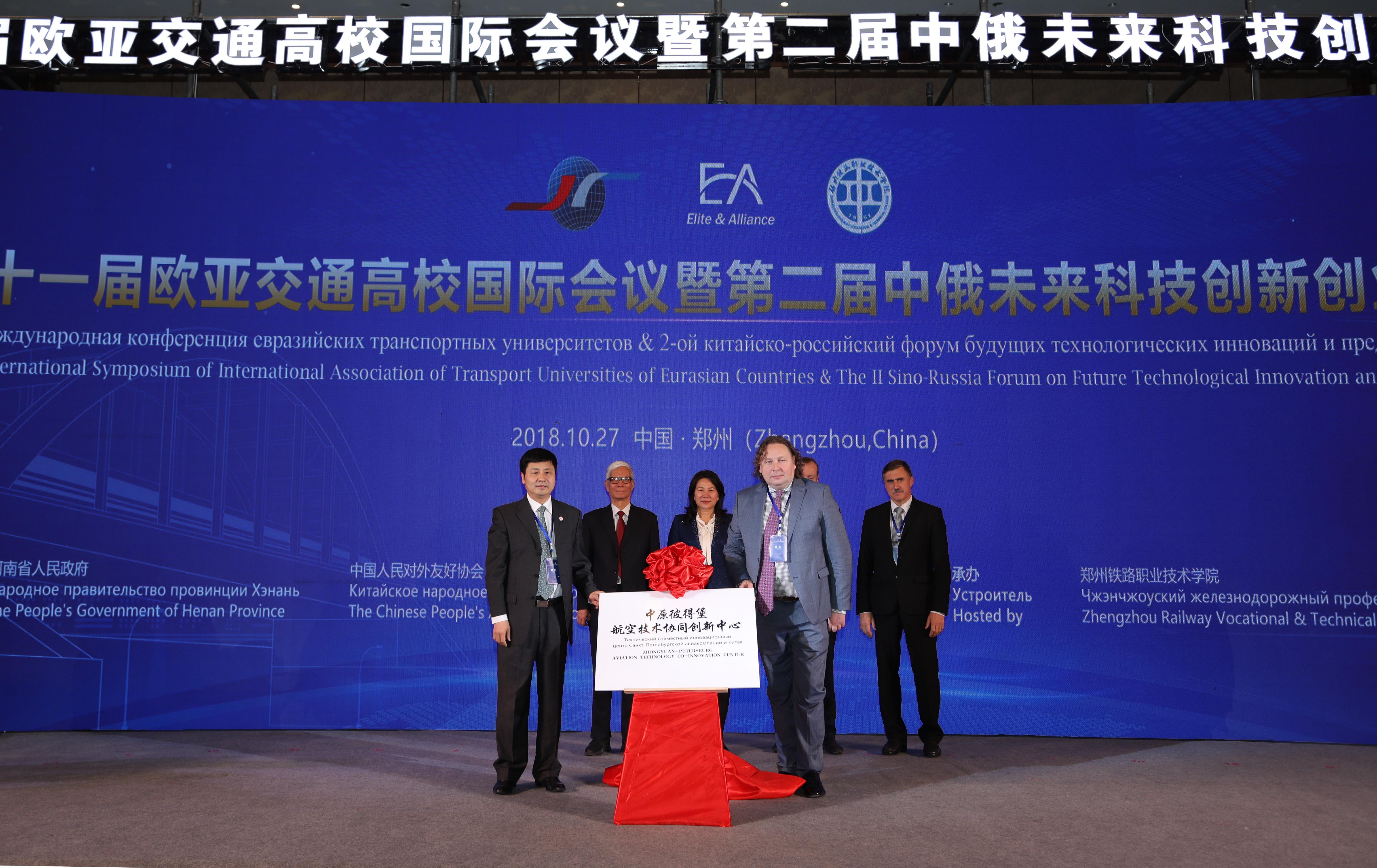 在河南省副省长霍金花、俄罗斯联邦工业贸易部部长特别助理阿尔什诺夫、中国工程院院士张彦仲、俄罗斯科学院院士卡利亚耶夫共同见证下,中原工学院院长王宗敏、圣彼得堡国立宇航仪器制造大学副校长洛谢夫为中原彼得堡航空技术协同创新中心揭牌,河南省委高校工委专职副书记、党组副书记郑邦山、国家铁路局总工程师严贺祥为河南省高校交通教育联盟揭牌。