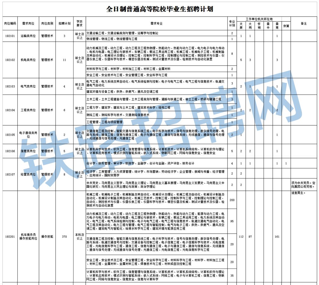 中国铁路太原局集团有限公司东起能源大港秦皇岛,西至黄河禹门口,北到煤都大同,南至古迹风陵渡,路网纵贯三晋南北,横跨晋冀京津两省两市,重载技术先进、货运量大、运输收入高、管内旅游资源丰富,是全路唯一运输业整体上市的集团公司,是山西省唯一的综合服务型5A级物流企业。根据企业发展需要,现将2019年全日制高校毕业生招聘有关事项公告如下: