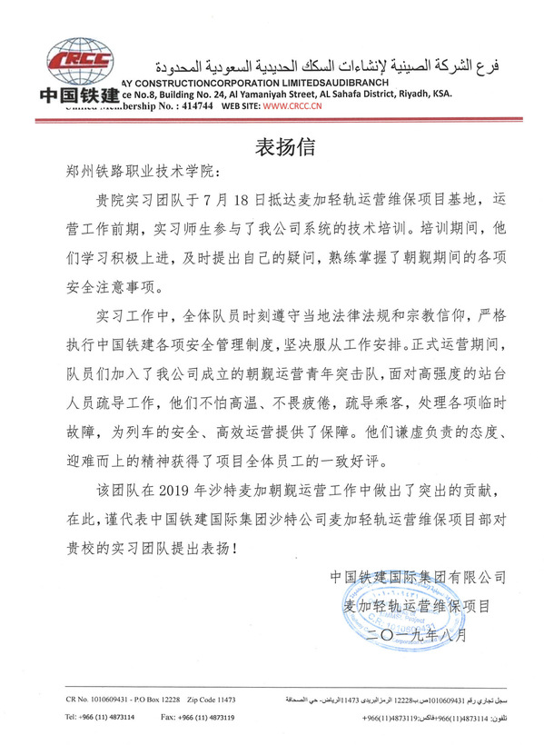 7月17日至8月20日,beat365选派机车车辆学院10名优秀学生和1名教师组成“郑铁城轨车辆实习团队”参与沙特麦加地铁车辆维保项目,这是beat365在校学生再次参与国际轻轨维保项目,是beat365积极响应国家政策,深化 “一带一路”服务倡议的有力举措。