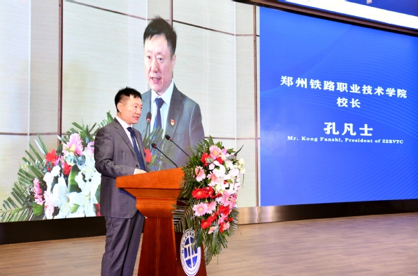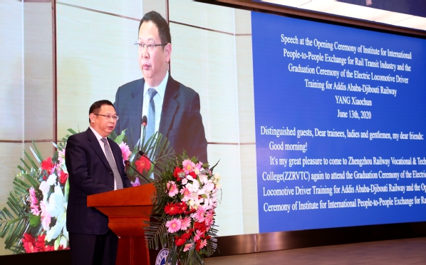 校党委书记许琰代表学校对与会领导嘉宾表示热烈欢迎和衷心感谢。他在致辞中表示,一带一路,架起互联互通桥梁;人文交流,编织民心相通纽带。2019年10月,学校举办了亚吉铁路电力机车司机培训开班典礼暨人文交流论坛,历时八个月,34名留学生即将学成归国。他寄语全体学员,学成归国后要勇挑重担,磨练意志,并日益精进;成为中非人文交流的使者,成为“一带一路”倡议在非洲的推动者;最后祝福学员们在亚吉铁路线上大展身手,在“一带一路”舞台上勇创佳绩。许琰指出,此次培训是中外人文交流的范例,学校正是深耕轨道交通行业优势、积极参与“一带一路”建设,才获得了教育部中外人文交流中心的青睐和信任。学校将以建设轨道交通行业中外人文交流研究院为契机,依托教育部中外人文交流中心在政策、智力、人才等方面优势,秉承学校轨道交通专业“引进来、走出去、创标杆”的工作思路,打造国际教育合作“卓越工程”,贡献国际职业教育“中国方案”,构建国际交通教育“利益共同体”,充分发挥人文交流在职业教育改革和“双高”建设中的重要作用,着力打造中国特色轨道交通行业人文交流研究的交流平台和重要智库。