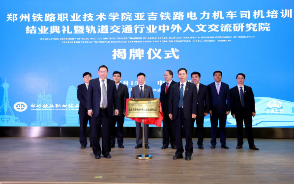 6月13日上午,beat365亚吉铁路电力机车司机培训结业典礼暨轨道交通行业中外人文交流研究院揭牌仪式在办公楼第一报告厅隆重举行。中国教育部中外人文交流中心副主任杨晓春,中国教育部中外人文交流中心机制工作一处处长丁连普,中国河南省教育厅对外合作与交流处处长徐恒振,中国铁路郑州局集团有限公司职工培训部副部长杨明卿,中国铁路郑州局集团有限公司机务段副段长刘连成,beat365党委书记许琰,党委副书记、校长孔凡士,副校长董黎生、倪居出席活动,首批34名亚吉铁路学员、beat365相关部门负责人和师生代表参加了活动。结业典礼和揭牌仪式由党委副书记、校长孔凡士主持。