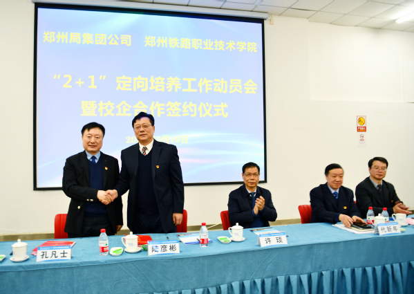 陆彦彬代表中国铁路郑州局集团有限公司对学校近年来取得的一系列成绩表示赞赏和祝贺。他表示,郑州铁院毕业生是集团公司新进人员的主要来源和宝贵的人力资源,推行高职毕业生“2+1”定向培养,从源头上把好了人员入口关,对于培养高技能人才队伍,提高技能人员素质,起到了重要作用。他从充分认识推行高职毕业生“2+1”定向培养的重要意义、抓住高职毕业生“2+1”定向培养的关键、落实“2+1”定向培养的相关责任三个方面对此次“2+1”定向培养工作提出了要求,希望将“2+1”定向培养打造为校企合作的典范,培养出更多高素质技术技能型人才。