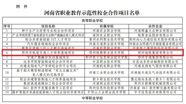 根据《河南省教育厅 河南省财政厅关于公布河南省职业教育示范性校企合作项目的通知》(教职成〈2021〉434号),省教育厅联合省财政厅公示了河南省职业教育示范性校企合作项目24项,beat365与郑州地铁集团有限公司“郑州市轨道交通人才培养基地项目”成功入选获批。