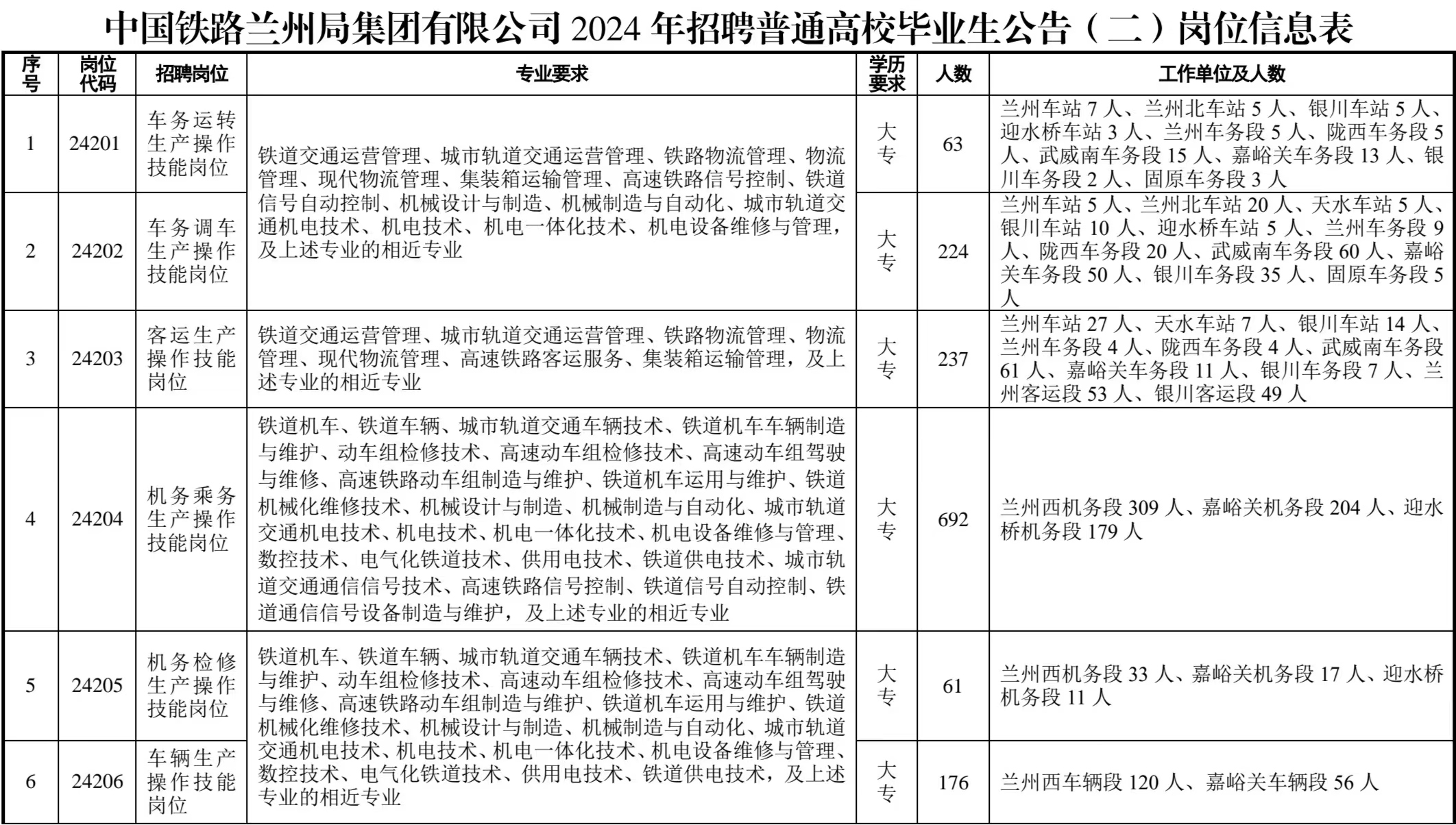 中国铁路兰州局集团有限公司因工作需要,招聘普通高等院校应届全日制大专(高职)学历毕业生,现将有关事项公告如下: