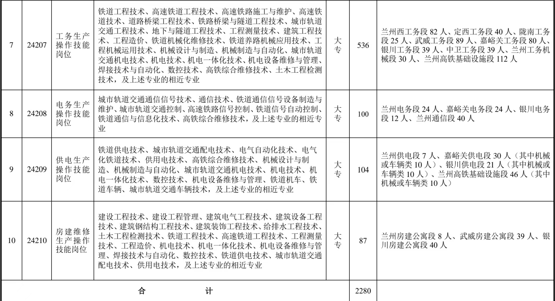 本次计划招聘2280人,招聘岗位均为铁路运输生产一线操作技能岗位,具体岗位、专业、工作单位及招聘人数详见附件。