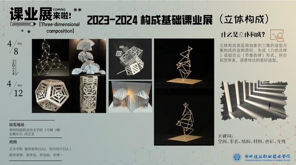 4月8日至12日,艺术学院举办了主题为“构成基础(立体构成)”的课业展。此次展览由艺术学院建筑装饰与室内设计专业2023级学生精心策划,景仲龙、李谷雨、李博一老师指导,课业展吸引了全校师生的广泛关注与热情参与。
