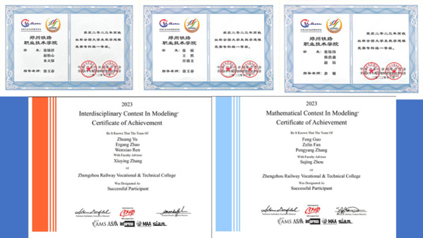 省部级荣誉奖励214项。其中全省教育系统教学技能大赛一等奖1项,河南省教师能力大赛一等奖1项,河南省工会教学竞赛一等奖2项,河南省教育厅信息化教学比赛一等奖1项,河南省高等职业教育课堂教学创新大赛一等奖2项,河南省高等职业教育教学能力大赛二等奖5项,河南省高等职业教育课程思政教学创新大赛三等奖1项,亚太地区大学生数学建模竞赛优秀指导教师一等奖1人,河南省“互联网+”大学生创新创业大赛优秀创新创业指导教师1人,挑战杯优秀指导教师2人,全国大学生数学建模竞赛省级一等奖66项、二等奖72项、三等奖36项,河南省“挑战杯”大学生课外学术科技作品竞赛一等奖1项、二等奖4项、三等奖6项,第15届“中国电机工程学会杯”全国大学生电工数学建模竞赛三等奖3项,河南第五届中华经典诵写讲大赛省级一等奖4项、二等奖1项,河南省第七届大学生艺术展演活动省级一等奖1项、二等奖4项、三等奖2项,河南省高等职业教育技能大赛英语口语一等奖1项,职场英语挑战赛演讲大赛一等奖1项,职场英语挑战赛写作大赛一等奖1项、二等奖2项,外教社词达人杯全国大学生英语词汇能力大赛特等奖3项、一等奖3项、二等奖9项、三等奖6项。