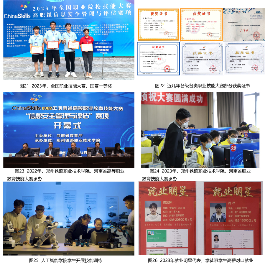 多年来,学院持续开展“专业认知(Knowledge)→专业讲座(Lectures)→专业培训(Training)→专业竞赛(Competition)” 等活动,以认知升级深入推进创新创业教育改革。秉持“服务学生、成就学生”的理念,以学生为中心,致力于学生个性化发展,厚植文化底蕴、精湛一技之长、锻造工匠精神,实现IT行业高质量就业。近五年,毕业生初次就业率始终保持95%以上,超过25%的学生起薪超8000元。学院重视学生技能大赛梯队建设,逐渐形成“以赛促学、以学促知、以知促行”的良好氛围,积极鼓励师生通过参加职业技能大赛提升自身专业技能。近五年,共取得各级各类大赛国家级奖项50多项,省级奖项近200项。其中,2023年8月,学院在全国职业院校技能大赛“信息安全管理与评估”赛项中斩获一等奖的好成绩,实现了河南省在该赛项国赛一等奖“零”的突破,也是本年度河南省唯一一个电子信息类全国职教赛国赛一等奖。