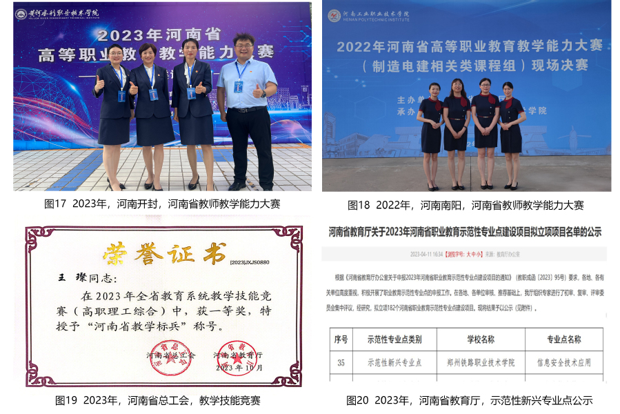 学院秉持“引进与培养并重,师德与师能共进”的理念,不断优化师资结构,提升教师素质。教学团队中教授2人,副教授18人,通过高学历人才引进和培育,目前博士4人,在培博士2人,河南省文明教师2人,河南省优秀共产党员1人,河南省教育厅学术技术带头人1人,河南省教学名师7人,硕士学历及具备“双师”素质的教师均超过90%,已形成了一支师德高尚、业务精湛、结构合理、乐于奉献的高技能高素质师资队伍。信息安全基础课程教学团队于2021年获批“首批河南省职业教育和继续教育课程思政示范项目教学团队”、7人2021年获得首批河南省职业教育和继续教育课程思政教学名师荣誉称号。2人2023年荣获全国职业院校技能大赛高职组“信息安全管理与评估”赛项优秀指导教师。近年来教学能力大赛成绩取得突破,获得全国仿真创新应用大赛、河南省教学能力各类大赛一等奖、二等奖等多项荣誉,荣获河南省思政教学名师称号。多名教师参加全国一带一路金砖赛、河南省职业技能大赛等多个赛项,并取得优异成绩。在竞赛中,与同行交流,拓宽视野,发现自身不足。同时,提升专业技能,为课堂注入新活力,更好地引导学生成长,推动教学质量的整体提高。