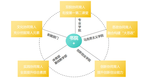 书院按照“一站集成、双院协同、三级联动、四个保障”的总要求,打造多元化、立体化、精准化育人体系,服务学生成长成才。目前已建成:集成一个平台:一站式服务平台;紧密双院协同:双院(书院+学院)协同育人机制;构建三级联动:学生队伍(团学会+志愿者)、导师队伍(1+3导师队伍)、管理队伍(书院班子+党政联席会);夯实四大保障:设施保障、队伍保障、资助保障、后勤保障;提供十项服务:思想教育、学业帮扶、职业规划、文化引领、法律普及、心理疏导、困难救助、就业指导、实践锻炼、安全管理。