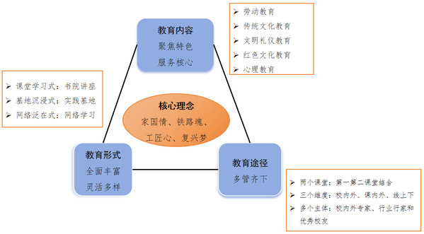 一是开展网络通识教育学习。分模块分层次开展网络通识教育。二是通过书院讲堂开展线上下通识教育。书院建设书院讲堂,邀请校内外专家、行业行家和优秀校友开展科普、学术讲座,通过线上观看和线上直播的形式进行全员参与。三是选择学生喜闻乐见的话题,以微信公众号开展主题通识教育直播,学生参与度高,深受学生喜爱。四是建立校内外实践教育基地和社会实践活动,开展基地沉浸式教育。五是课程与思政同频共振。开设“大国高铁纵览”“铁路精神品读”与铁路传统文化、中华优秀文化教育系列微课等特色通识课程,注重弘扬工匠精神、贯通专业伦理和职业道德培养,培养具有 “家国情、铁路魂、工匠心、复兴梦”时代新人。
