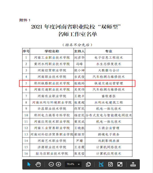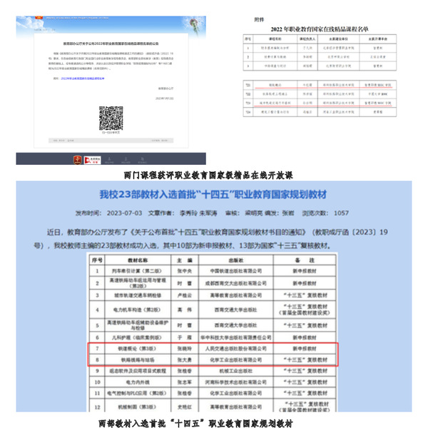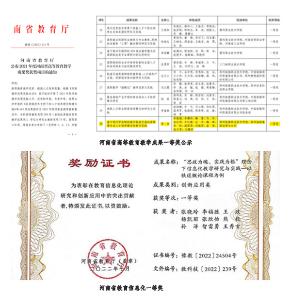 荣获河南省高等职业教育教学成果奖一等奖2项;建设省级及以上课程5门,其中2门入选国家级精品在线开放课程,2门课程入选省级精品在线开放课程,1门课程获批省级一流核心课程。连续两年承办河南省城轨交通站务1+X证书制度试点师资培训。3门教材立项国家“十四五”规划教材建设,获批省立体化教材2部。