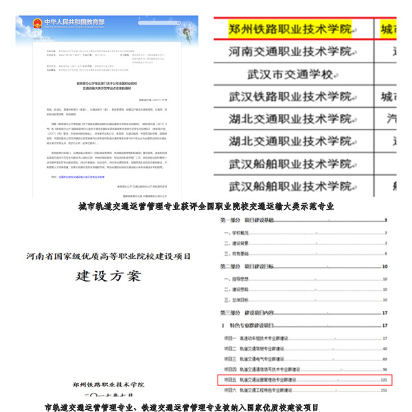 学院开设的城市轨道交通运营管理专业获批全国职业院校交通运输类示范专业、教育部第三批现代学徒制试点专业、国家级骨干校建设专业、国家级优质校建设骨干专业等;铁道交通运营管理专业获批河南省骨干专业、河南省专业综合改革试点专业;现代物流管理专业被认定省级示范校重点专业,三个专业均被纳入国家优质校建设项目“轨道交通运营管理专业群建设”并验收通过。获批河南省职业教育校企合作示范性项目-郑州轨道交通人才培养基地。