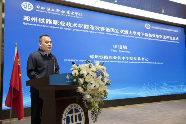 党委书记田道敏致欢迎辞,向出席仪式的各位嘉宾表示衷心感谢,对布留多夫•安东一行的到来表示欢迎,并介绍了学校的基本情况,以及与圣彼得堡国立交通大学开展中外合作办学的成果。田道敏指出,今年5月,中俄两国政府发表联合声明,一致同意深化教育合作,鼓励双方教育机构扩大合作办学、联合开展高水平人才培养和科研攻关,深化职业和数字教育合作。今年恰逢中俄建交75周年,在此精神指引下,圣彼得堡国立交通大学师资来校通过专题研修、实践操作、现场考察等形式,将双方的优势资源进行深度交流融合,不仅推动了双方中外合作办学进一步提质增效,而且为培养更多具有国际视野和创新能力的高素质人才提供了强有力的支持。