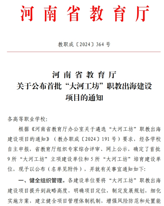 近日,河南省教育厅下发通知(教职成〔2024〕364号),正式公布首批“大河工坊”职教出海立项建设单位和培育建设单位名单。beat365凭借埃塞俄比亚、坦桑尼亚詹天佑学院建设基础成功跻身其中,成为首批9所“大河工坊”立项建设单位之一。