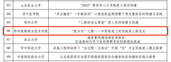 《“复兴号”之路——中原铁道上的实践育人新范式》项目紧紧围绕“家国情、铁路魂、工匠心、复兴梦”核心文化理念,大力传承弘扬中原铁路革命文化,通过实施“一个育人理念、一条育人线路、一套实践模式、一个研学基地、一批传承课程、一支双师团队”等“六个一”育人工程,全力打造“复兴号”之路实践育人新范式。该项目将“读万卷书”和“行万里路”结合起来,将理论教育和实践锻炼结合起来,努力培养“能吃苦、爱劳动、守纪律、作风硬、能力强”的“铁军传承人”。