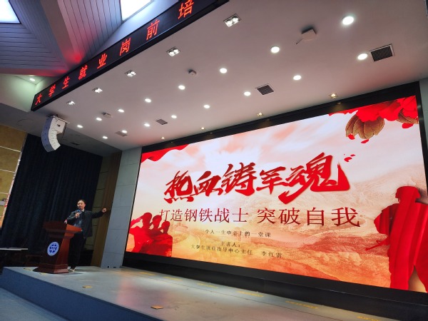 3月11日下午,艺术学院邀请中国室内装饰协会河南分会大学生就业指导中心主任李红雷举办了一场以“热血铸军魂——打造钢铁战士,突破自我”为主题的大学生就业岗前培训宣讲会。建筑装饰设计教研室主任李博一老师主持会议,建筑装饰工程技术与室内艺术设计两个专业以及视觉传达设计专业的全体师生参加了本次活动。