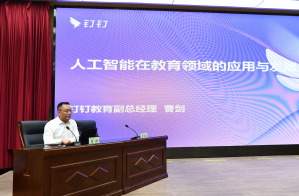 签约仪式结束后,曹剑副总经理发表了题为“人工智能在教育领域的应用与发展”的专题报告。报告深入探讨了全球范围内大模型的发展趋势,重点突出了国产大模型DeepSeek在技术创新方面的重大突破。同时,报告还详细介绍了钉钉AI的发展历程,以及钉钉智能体在“学用创赛评”体系中的开发进展。
