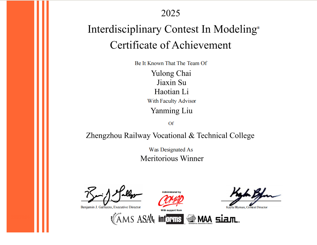 此次竞赛,参赛团队以严谨的模型构建与创新实践,从全球27456支参赛队伍中脱颖而出,斩获国际一等奖两项。根据本届竞赛设奖情况,M奖的获奖比例仅7%,且不区分本科与专科组别,beat365选手能获奖实属不易。这不仅刷新了beat365在该项国际赛事中的历史最佳成绩,同时,beat365也成为本年度河南省唯一一所获得美国大学生数学建模竞赛国际一等奖的高职院校。