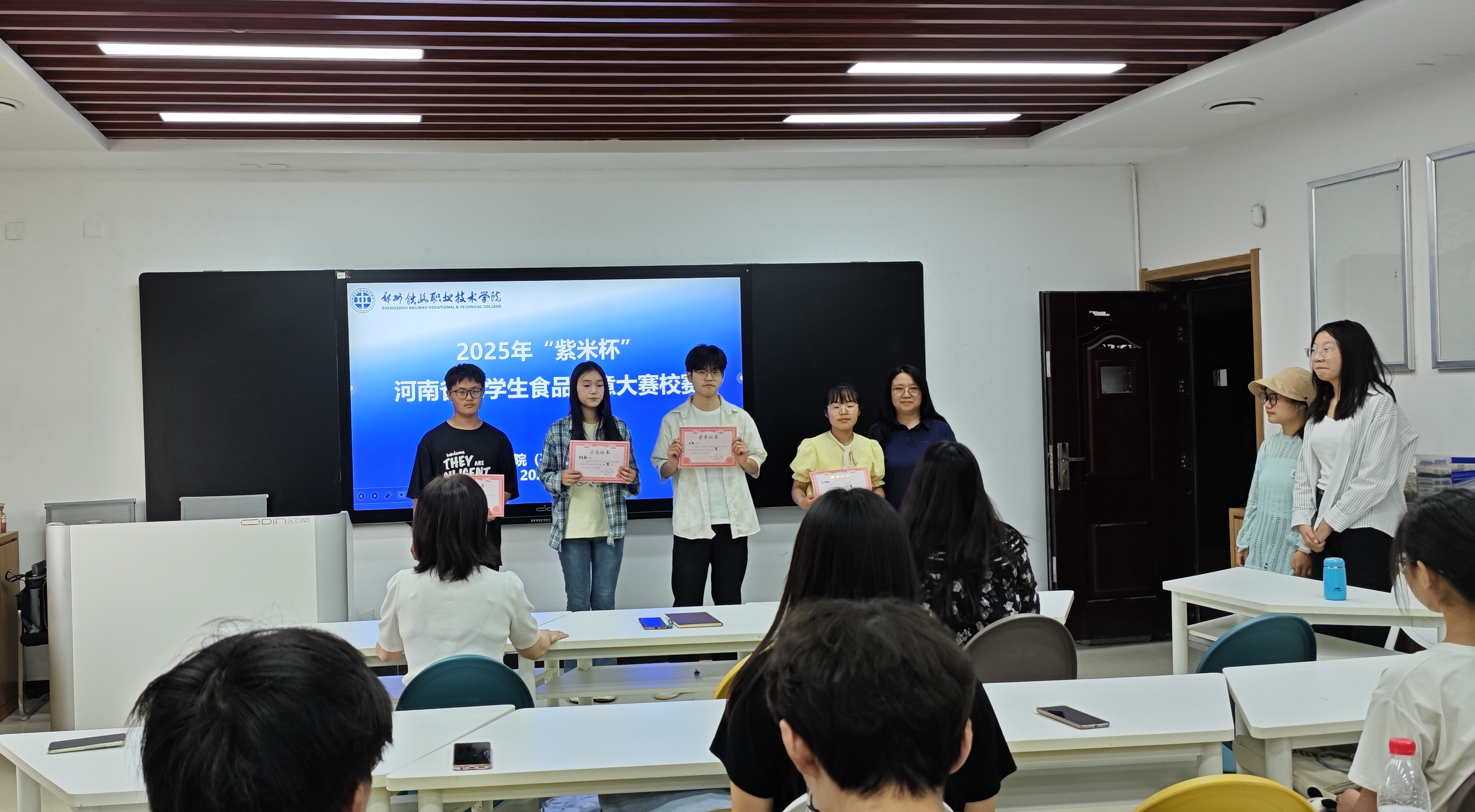 比赛邀请四名评委针对作品报告书、产品创意和现场PPT汇报等环节进行评审,评选出一、二、三等奖各4项,其中前4名被推荐参加河南省食品科学技术学会2025年“紫米杯”河南省大学生食品创意大赛决赛。药学院院长张晓霞为获奖队伍代表颁发了荣誉证书,并高度赞扬同学们的创意和所做的努力,同时鼓励晋级队伍积极备战,争取取得好成绩。