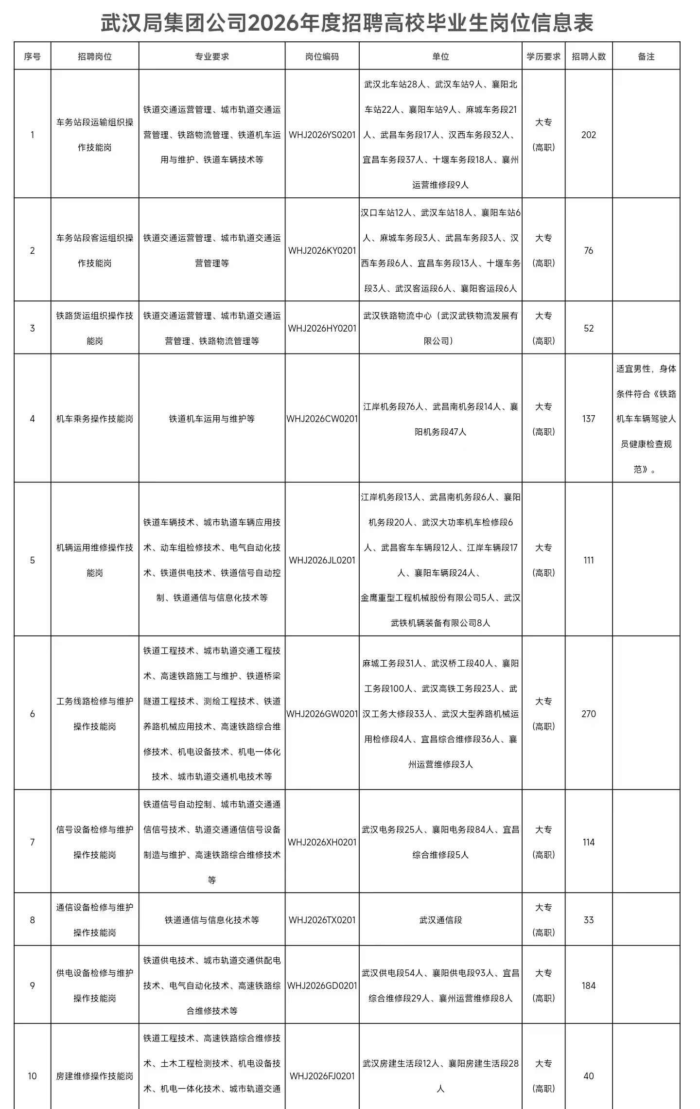 中国铁路武汉局集团有限公司根据经营发展需求,拟招聘全日制普通高等院校大专(高职)学历毕业生,现将有关事项公告如下。