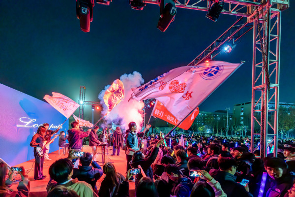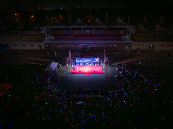 18时,以“乐潮丝路‘音’你沸腾”为主题的电音节准时开幕。舞蹈、独唱、合唱轮番上阵,更有模特走秀、抽奖环节和主持人互动。多支乐队连续献演,他们凭借专业的混音技巧和极具感染力的舞台表现,为现场观众带来了涵盖多种风格的电子音乐作品。从舒缓的旋律到激昂的节奏,每一首曲目都引发全场共鸣,台下师生跟随着音乐节拍挥舞荧光棒,形成一片璀璨的“星光海洋”。