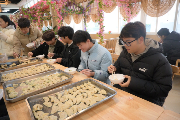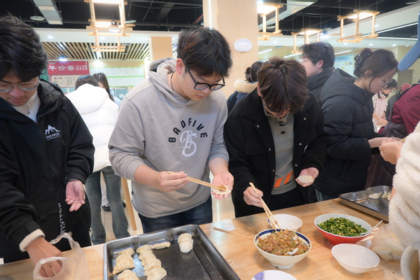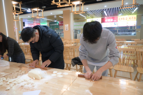 活动现场,志愿者们早早布置好了场地,擀面杖、饺子皮、各式馅料一应俱全。大家围坐在一起,有经验的同学手法娴熟,动作利落,转眼间一个个饱满的元宝饺、月牙饺便呈现在眼前;初学的同学则在“师傅”的指点下认真模仿,虽然形状各异,却充满了创意与心意。现场气氛热烈,从和面、擀皮到包馅、摆盘,大家分工协作,交流着家乡的冬至习俗和包饺子的趣事,老餐厅里弥漫着家的温暖与节日的喜悦。