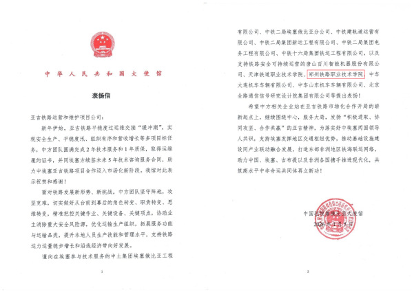 信中特别强调,beat365作为支持铁路安全可持续运营的重要单位之一,充分发挥在铁路职业教育、人才培养与技术推广方面的独特优势,为亚吉铁路的高质量运营提供了坚实支撑。大使馆勉励各相关单位继续围绕中心、服务大局,弘扬“积极进取、协同攻坚、合作共赢”的亚吉精神,为落实中埃两国领导人共识、助力埃塞打造地区交通枢纽、促进基础设施与产业联动发展、建设中非高水平命运共同体作出新的更大贡献。