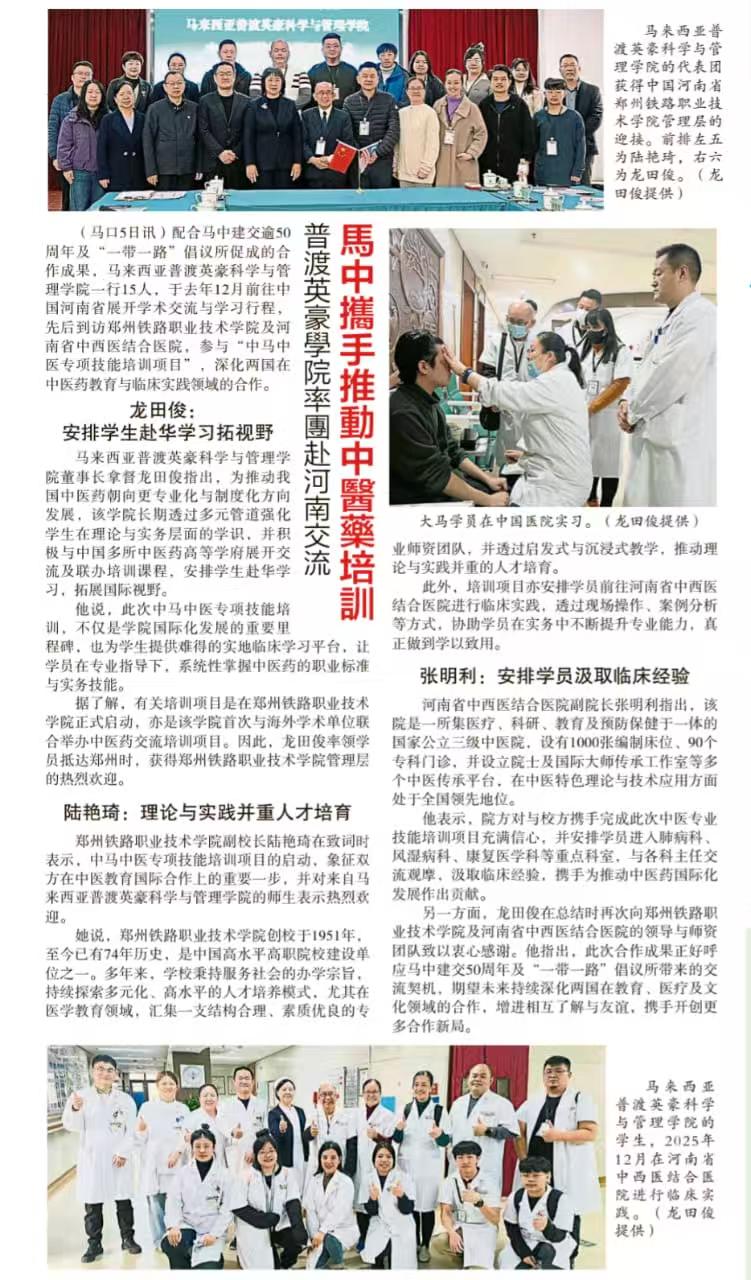 此次培训项目获得马来西亚《星洲日报》的专题报道,体现了东南亚地区对beat365中医药教育水平的高度认可。学校将继续发挥多元办学特色,深化产教融合,拓展国际交流,为推动中医药文化国际传播、服务人类健康事业贡献更多力量。