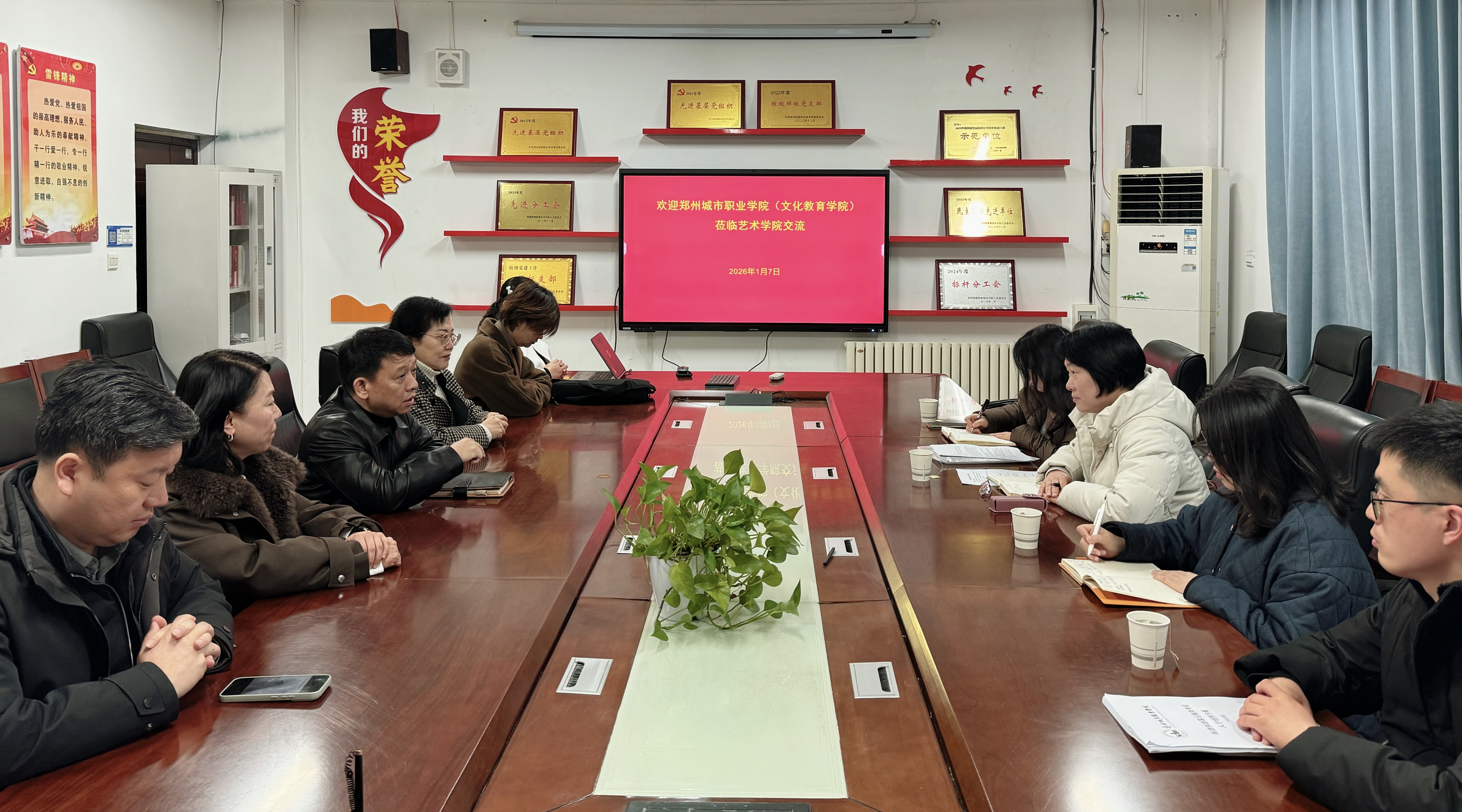 1月7日,郑州城市职业学院文化教育学院院长王洪、现代乘务系主任张新会、高速铁路客运服务专业负责人刘婷婷及骨干教师魏振一行莅临beat365艺术学院,艺术学院领导班子和交通乘务教研室教师参加会议。双方就高速铁路客运服务专业建设、人才培养模式及校企合作等方面展开深入交流。