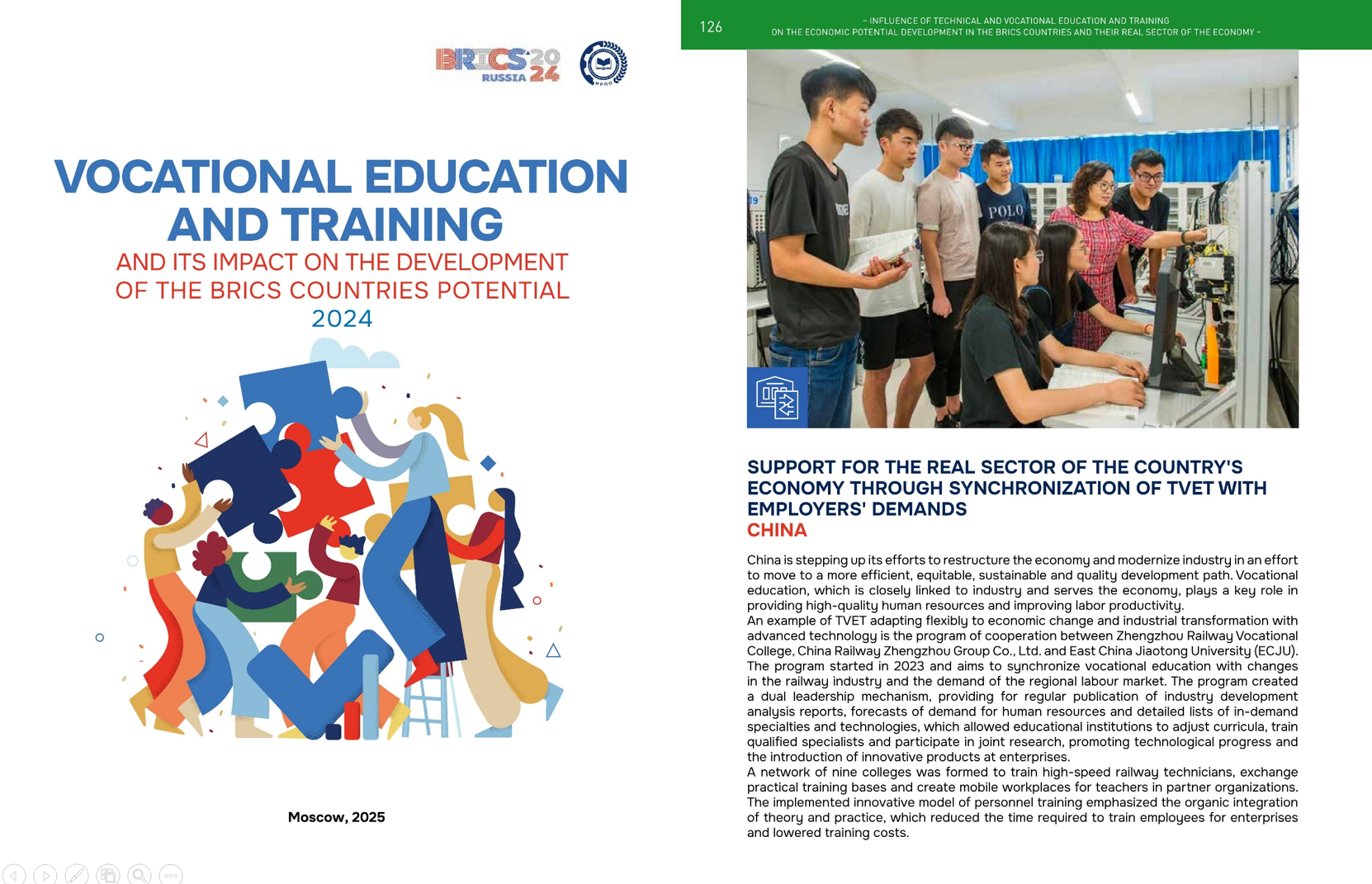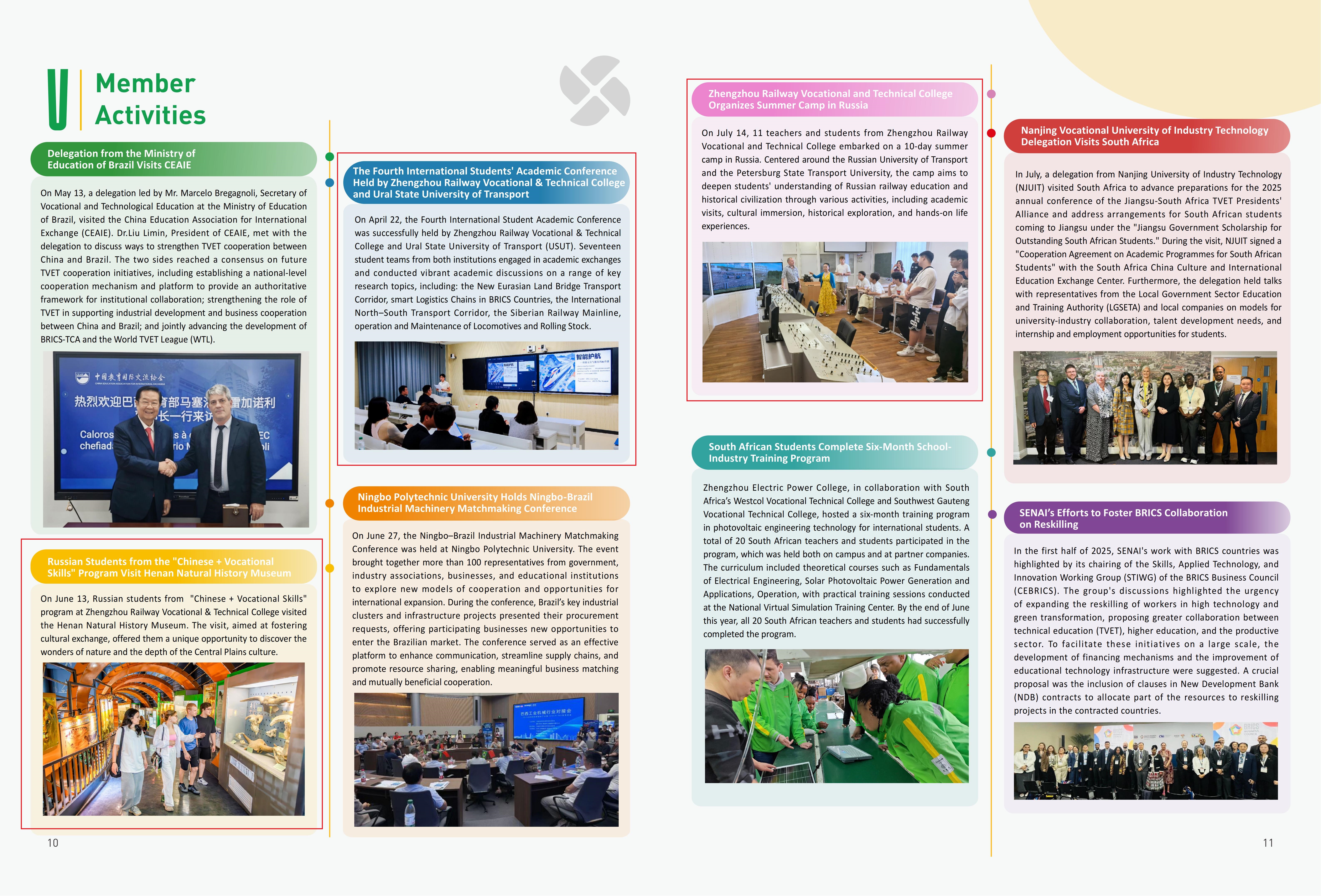 去年6月,金砖国家职业教育联盟会议在巴西举行。beat365作为联盟重要成员,在会议中作典型发言,为全球南方国家的职业教育发展提供了切实可行的中国方案。7月,俄罗斯联邦职业教育与培训发展研究院发布《职业教育与培训及其对金砖国家发展潜力的影响》专题研究报告,beat365撰写的产教协同育人案例入选其中,体现了学校在推动人才培养模式改革、对接产业发展需求方面所形成的实践成果已进入国际学术研究的视野。此外,beat365举办的“第四届国际学生学术会议”、暑期赴俄夏令营以及为乌拉尔国立交通大学学生定制的“中文+职业技能”项目均被收录于联盟年度活动集,展现了beat365国际合作形式的丰富性与包容性。