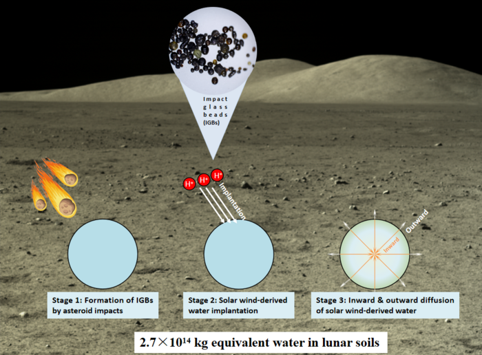 研究者从嫦娥五号月壤样本中提取了撞击事件中产生的玻璃珠,并分析了其中的水含量。他们确认撞击玻璃珠内储存了水,而且这些水与太阳风起源相符。此外,单独玻璃珠里水的分布模式也提示,水能通过扩散在玻璃珠里快速聚集,时间尺度只需几年,然后又会快速释放。作者认为,这代表月球表面有一个高效的补给机制,能驱动活跃的水循环。作者表示,撞击玻璃珠内的水比较容易开采,或许可以作为未来探月任务的潜在水源。