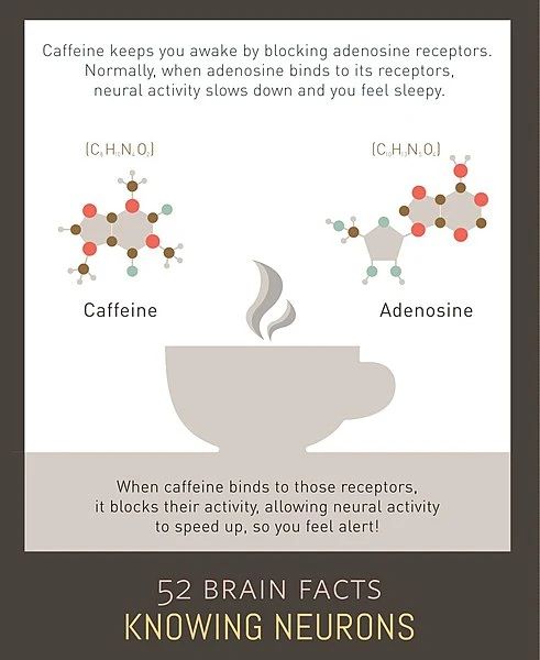 腺苷是一种神经递质,随着一个人清醒的时间变久而逐渐累积,使人变困。因为咖啡因的分子结构和腺苷类似,它就可以和腺苷的受体结合,负负得正,从而干扰腺苷的作用,让人保持清醒。