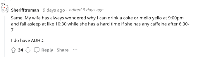 我高中的时候大部分时间都要灌激浪(咖啡因饮料),因为激浪让我镇静。我到了30来岁才被诊断出有多动症。在我身上咖啡因的效果和其他人是相反的。