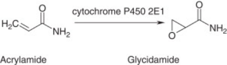 这些丙烯酰胺进入人体后,会被迅速吸收,并分布到许多器官和组织中。在组织中,它们会被细胞色素P4502E1(一种酶)催化形成缩水甘油酰胺(glycidamide,GA)。丙烯酰胺和GA均能结合人体内的血红蛋白、蛋白质、DNA和各种酶等等。