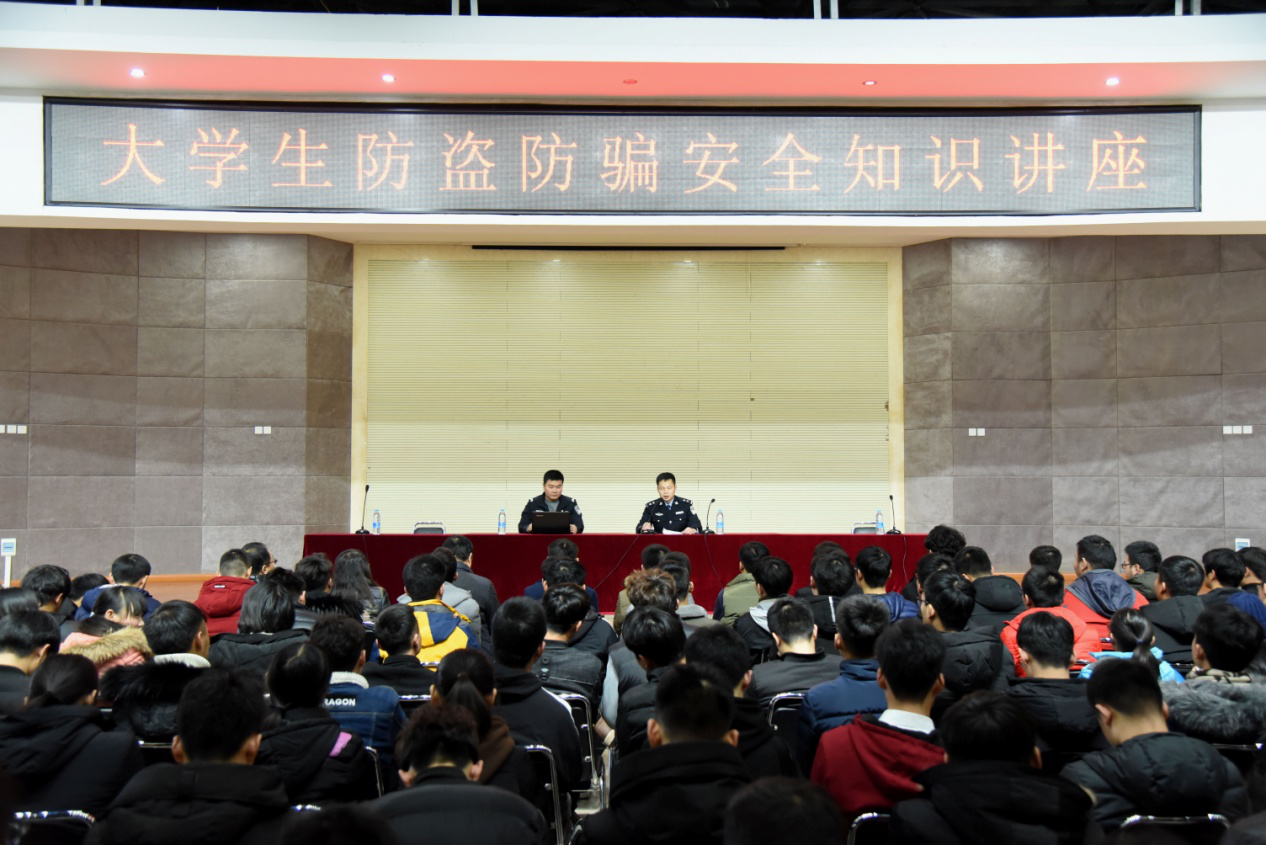 为进一步提高学生防盗、防骗安全防范意识和自我防范能力,预防和减少校园可防性案件的发生,深入推进平安校园建设,12月19日下午,学校邀请郑州市公安局龙子湖分局民警申永川在大学生活动中心开展了“大学生防盗防骗安全知识” 专题讲座。学校各部门义务消防员、各系学生代表、治保部学生干部、保卫处全体人员近300人聆听了讲座。
