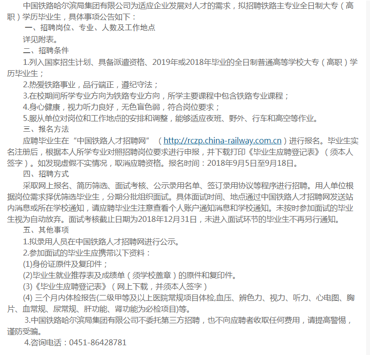 2018年beat365英国官方网站招聘信息之十九——中国铁路哈尔滨局集团有限公司2019届毕业生招聘公告