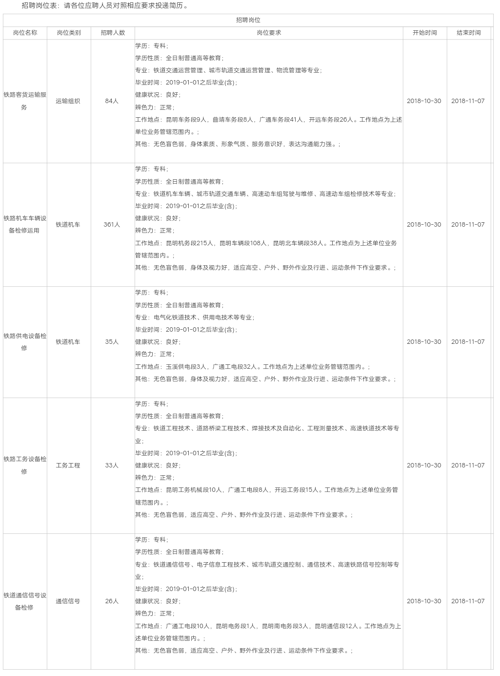 中国铁路昆明局集团有限公司根据企业发展对人才的实际需求,招聘2019届全日制高职大专毕业生,具体事宜公告如下: 一、招聘人数、专业、岗位及工作地点 本次计划招聘539人,具体专业、岗位要求等见招聘计划表(附件)。本批次招聘全部为生产一线操作技能岗位,录用的毕业生分配到昆明局集团公司所属单位管辖的车间、班组范围内工作。 二、应聘条件 1.遵纪守法,品行端正,热爱铁路事业。 2.具备岗位要求的专业素质和能力。 3.身心健康,无色盲色弱,符合岗位所需的身体条件。 4.列入国家招生计划、具备派遣资格、2019年毕业的全日制普通高等院校高职大专毕业生,在校期间所学专业为铁路专业或相近专业。 5.服从昆明局集团公司所属用人单位对岗位、工作地点的安排和调整,能够适应铁路的工作环境及倒班、夜班、高空和户外、野外作业等要求。 三、招聘程序 (一)网络报名。应聘毕业生于2018年11月1日~2018年11月7日登录中国铁路昆明局集团有限公司人才招聘平台(https://rczp-beta.kunming-railway.cn)进行网上报名,认真填写个人基本信息、教育经历、外语和计算机能力、社会实践经历、奖惩情况等,并打印“毕业生应聘登记表”,同时在应聘登记表最后写明应聘的单位和岗位。 (二)面试考核。2018年11月10日前根据岗位需要审核筛选毕业生材料并择优组织面试签约。未进入面试考核环节的毕业生恕不通知。 1.现场应聘须知。参加现场资格审查人员须携带以下资料: (1)从报名网站上打印的“毕业生应聘登记表”。 (2)应届毕业生就业推荐表、成绩单原件、本人第二代身份证及复印件、就业协议书及能证明本人能力的其他材料。 2.面试考核流程。 (1)现场材料审核确定面试人员。通过核实毕业生就业推荐表、在校成绩单、各类证书等应聘材料;审核毕业生主修课程;查验毕业生体检报告。根据招聘岗位需求,综合分析应聘毕业生个人信息,确定面试人员。 (2)面试考核。面试包括与应聘毕业生面对面语言沟通交流及身体条件的考察测试。语言沟通交流一般通过自我介绍、提问交流等方式考察毕业生语言表达、逻辑思维、应变处理等能力及应聘动机、个人意愿、人岗匹配等;身体条件考察,一般包括目测身体、形象等,检查肢体协调能力以及视力、辨色测试等。 (3)确定拟录用人员。通过面试考察、体格检验、综合比选等,择优确定拟录用人员。 (三)公示。对拟录用的毕业生,在中国铁路人才招聘网和中国铁路昆明局集团有限公司人才招聘平台进行公示。 (四)签订就业协议及补充协议。对公示无异议的,签订毕业生就业协议书及补充协议。 四、其它事项 1.本次招聘仅接受应聘人员网络报名,无其它报名方式。 2.应聘人员须保证有关报名信息和所提交应聘材料的真实性,如弄虚作假,一经发现,取消应聘及录用资格。 3.拟录用人员集中报到后,统一组织身体检查,不合格者不予接收录用。 4.只接受高职大专毕业生报名,专业、学历不符者请勿报名,请勿邮寄简历,不接受任何形式的上门求职。 5.未委托第三方招聘,也不向应聘人员收取任何费用,请提高警惕,谨防受骗。 6.昆明局集团公司人事处保留对招聘公告及相关规定的最终解释权。 7.咨询电话:0871-66122731,咨询时间:工作日8:00-11:30 14:00-17:00。 昆明局集团公司人事处 2018年10月30日