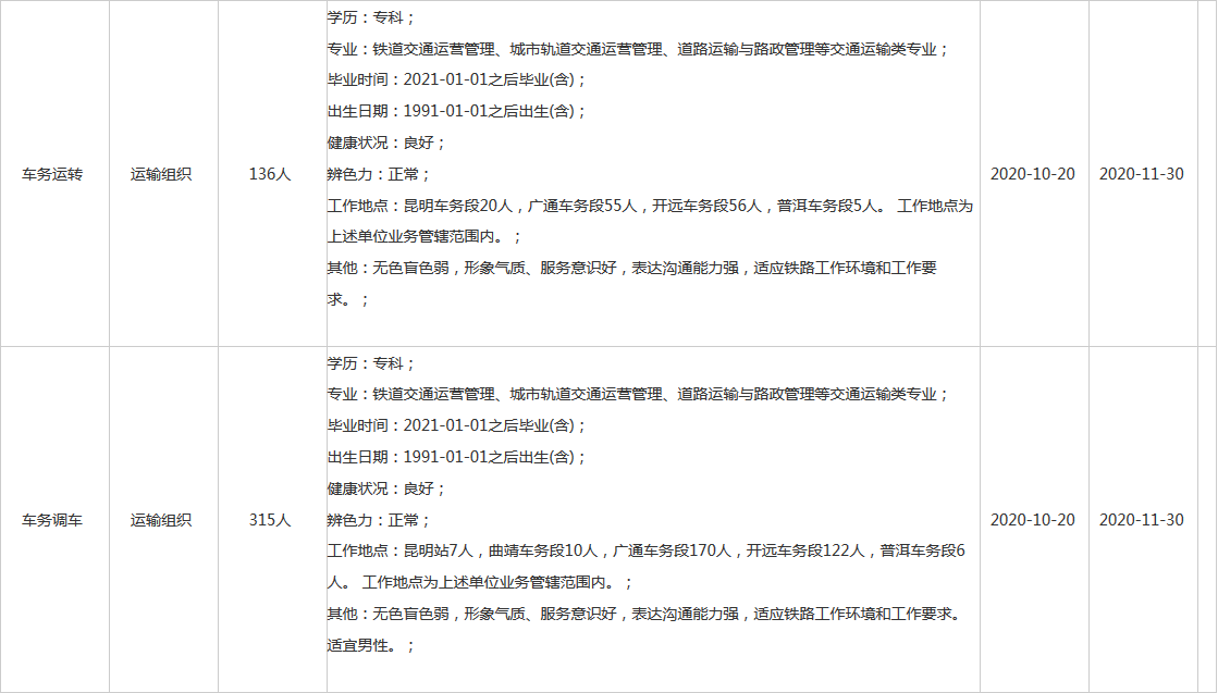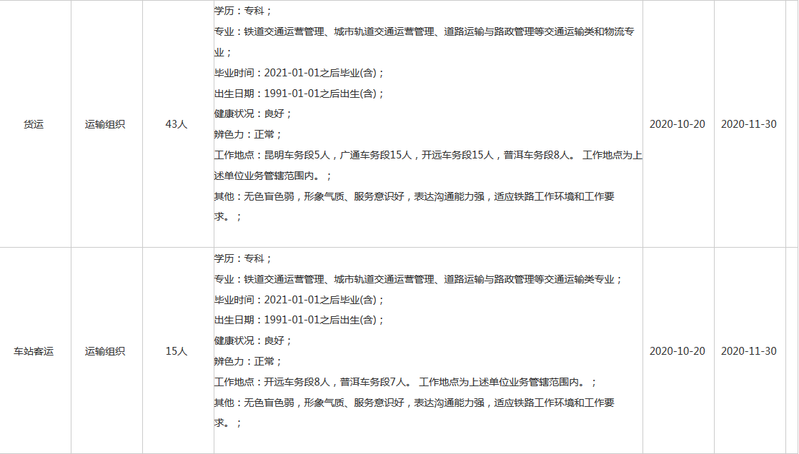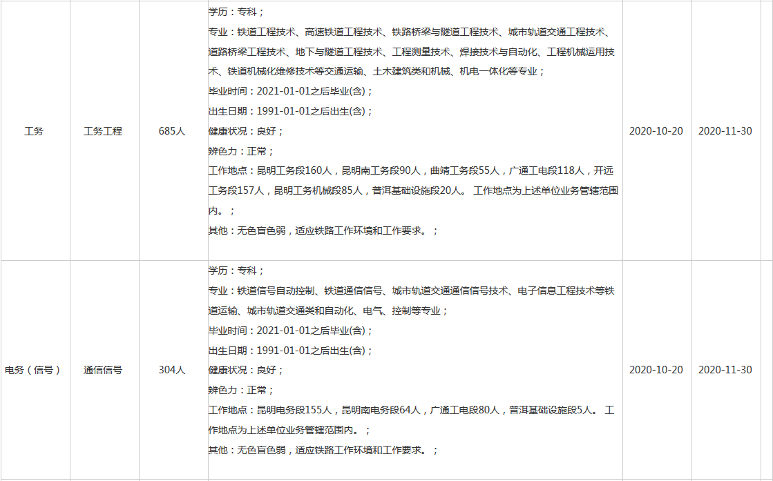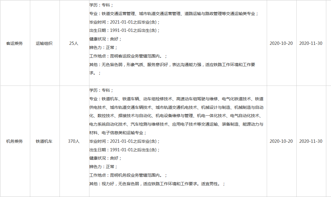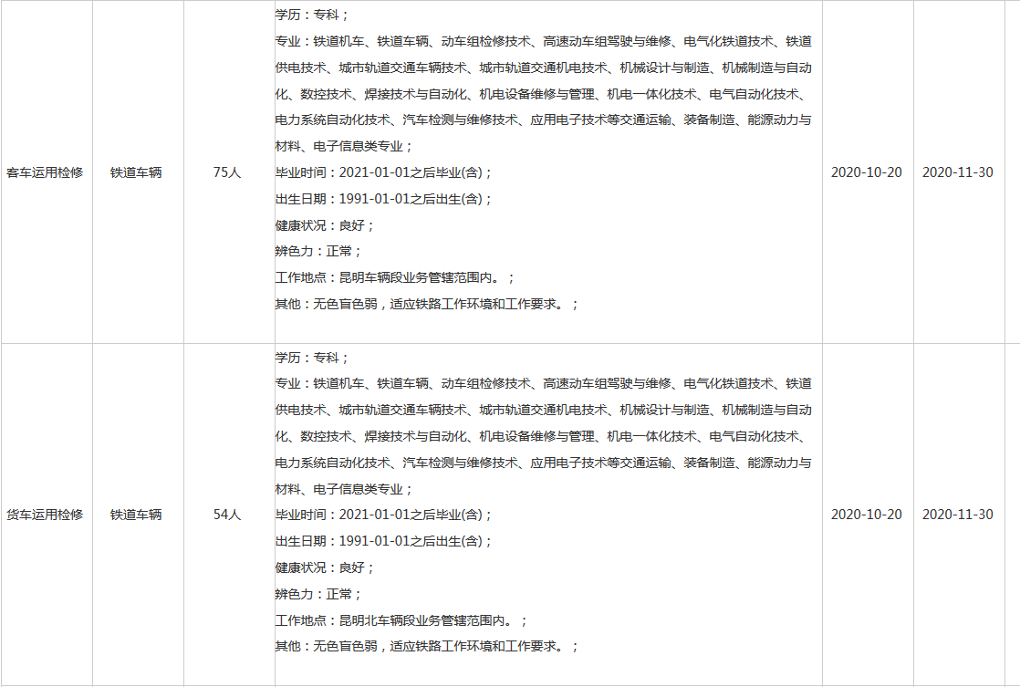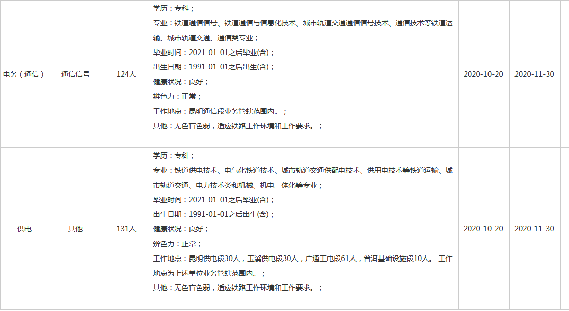 中国铁路昆明局集团有限公司根据企业发展对人才的需求,现将招聘2021年大学毕业生具体事宜公告如下: