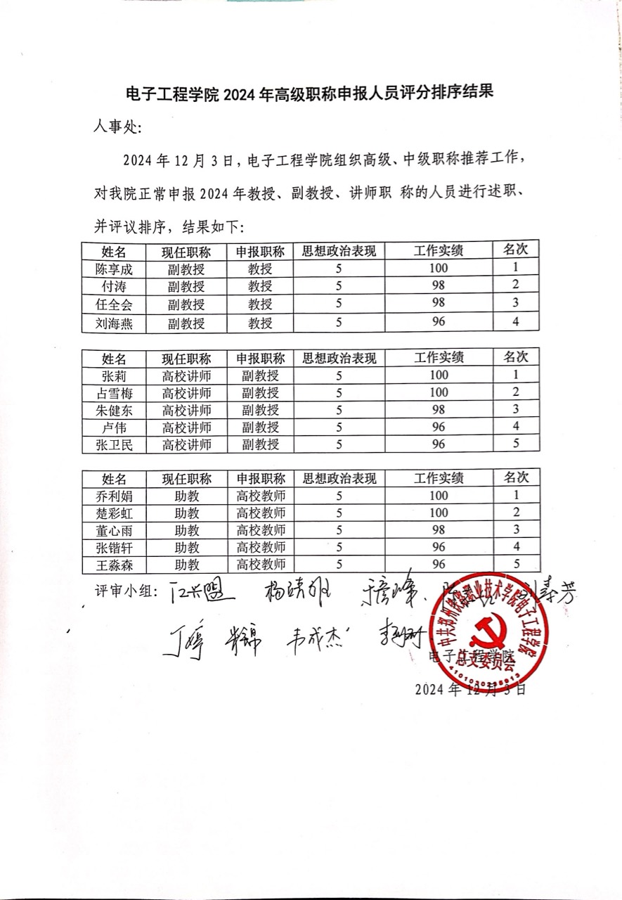 根据学校职称评审工作安排,依据《电子工程学院2024年职称评审推荐办法》要求,电子工程学院于2024年12月3日召开了学院职称评审推荐大会,经评审小组推荐,现对评分排序结果进行公示,公示期3天,公示期间,如有异议,请拨打0371-60867955。