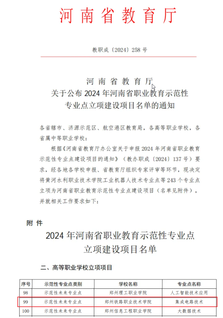 近日,河南省教育厅发布《2024年河南省职业教育示范性专业点立项建设项目名单的通知》(教职成〔2024〕258号),我院集成电路技术专业成功入选示范性未来专业点。