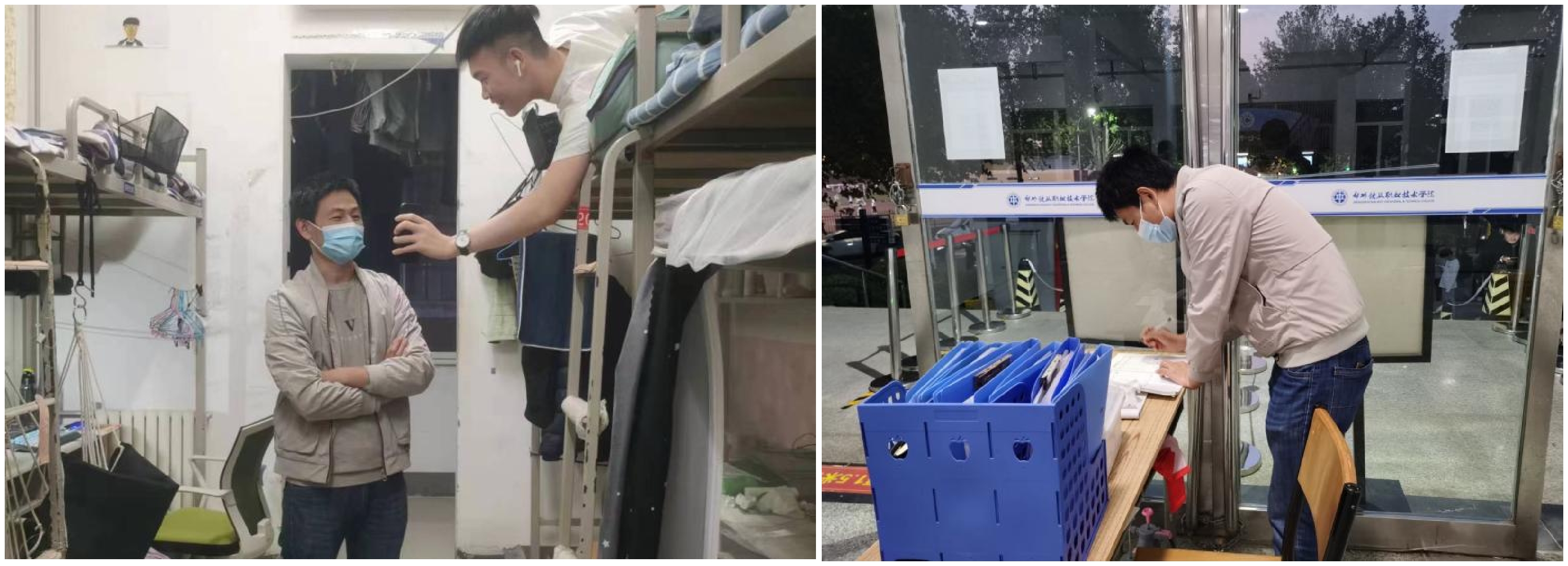 凌晨五点二十,在校工作的张景景老师接到了疫情电话后,立刻起身穿衣奔赴到二七书院。张老师主动承担了二七书院近40个宿舍、约300名学生的生活保障工作:从早六点半到晚十点,学生的三餐供应、核酸检测组织、抗原试剂等物资发放、代买生活必需品和急需药品等等,事无巨细。一天时间里,往往自己还没吃饭,就要给学生送下一顿饭。