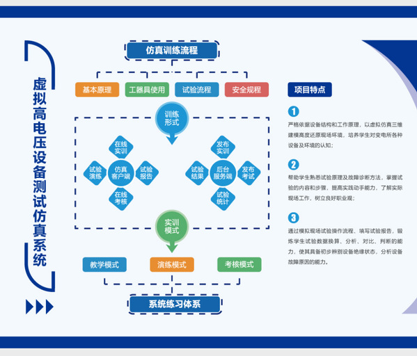 The simulation system has teaching mode, drill mode and assessment mode. It includes eight equipment test modules, such as traction transformer, SF6 circuit breaker and current transformer etc.