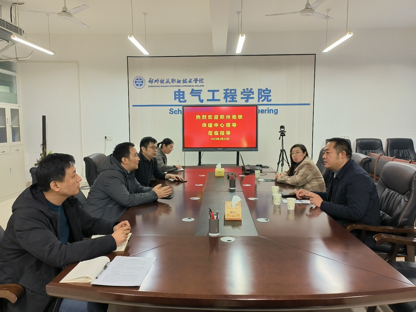 2月24日,郑州地铁供建中心主任张家涛、副主任李洁一行来beat365电气工程学院交流,电气工程学院党总支书记李学武、院长吉鹏霄接待并出席交流活动,学院班子成员、专业教师参加交流活动。