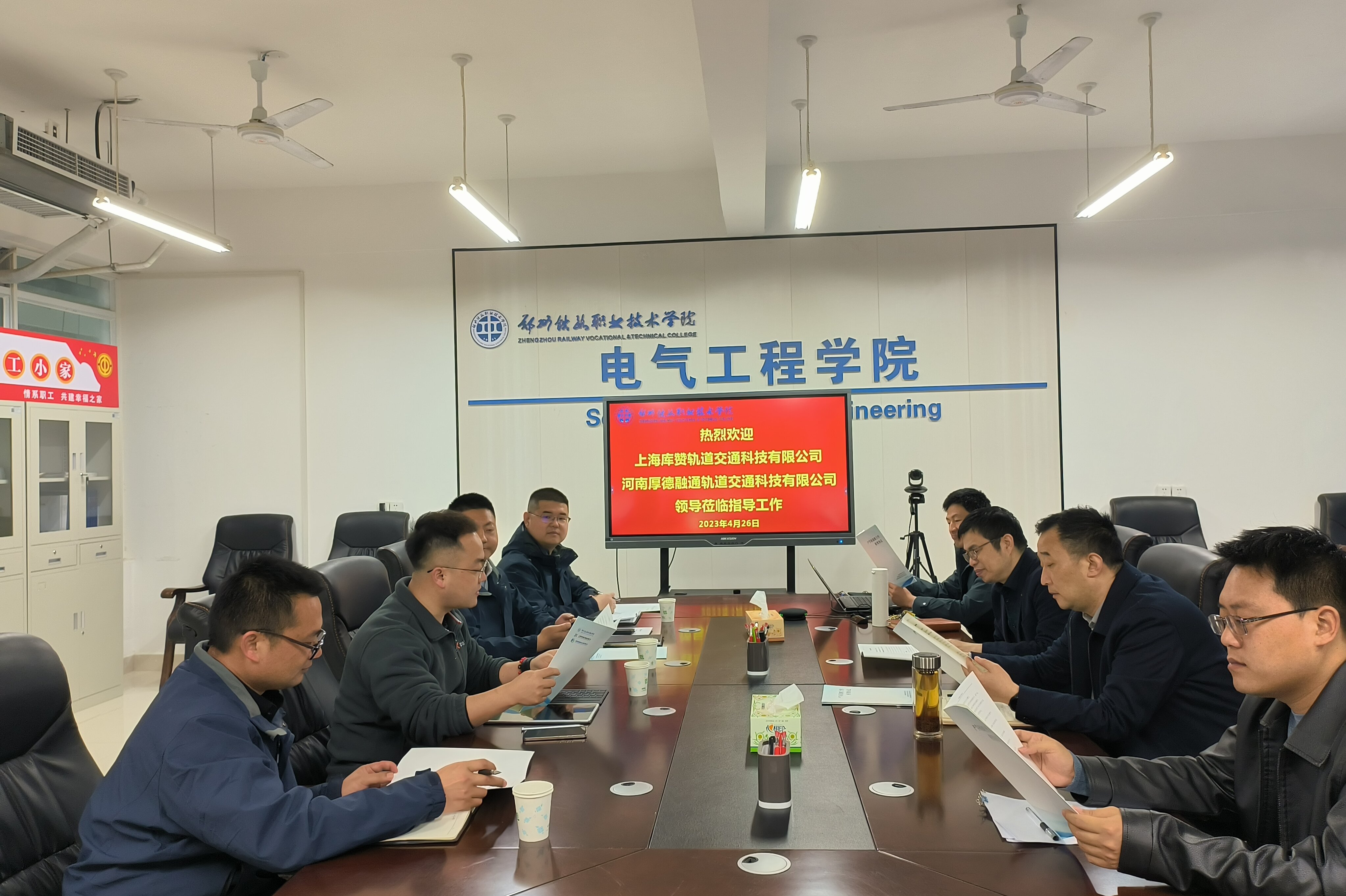 为高效推进产学研落地,积极探索校企联合的双创教育,4月26日,上海库赞轨道交通科技有限公司监事张国富、姚安峰等一行四人来校交流。电气工程学院党总支书记李学武、院长吉鹏霄、办公室主任马帅及相关专业老师参加座谈交流。