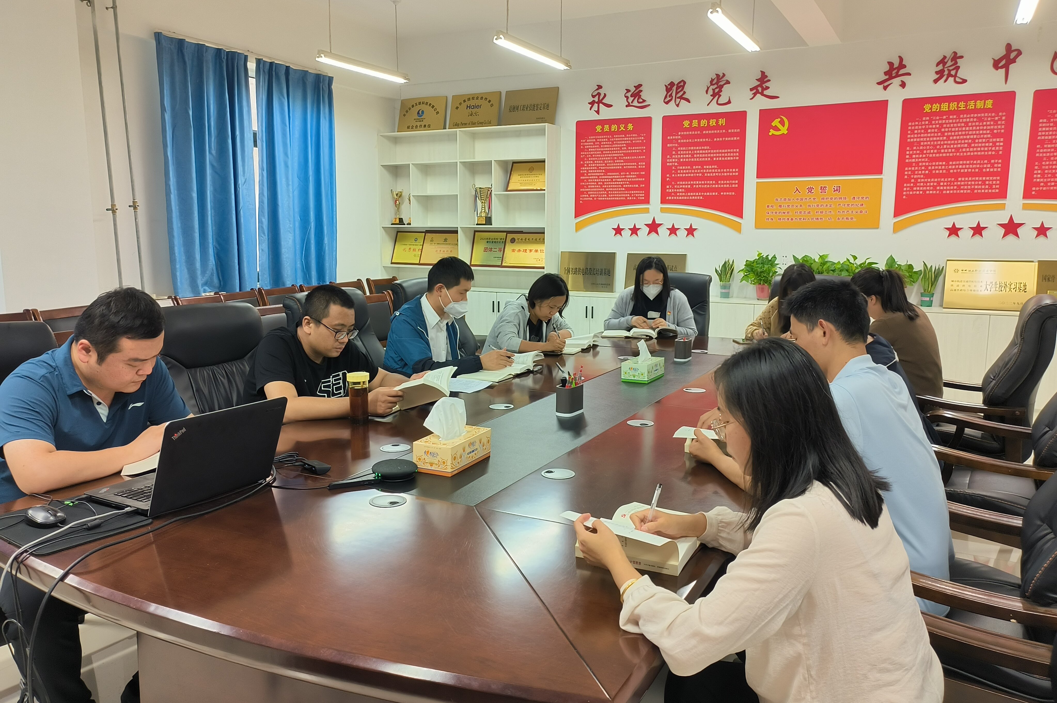 读书会现场,全体青年教师认真研读了《习近平新时代中国特色社会主义思想专题摘编》,并交流了心得体会。主要内容有:一、新时代中国特色社会主义思想实现了马克思主义中国化时代化新的飞跃、新时代中国特色社会主义思想的精神实质和丰富内涵 ;二、新时代中国特色社会主义思想实现了马克思主义中国化时代化新的飞跃;三、把握好新时代中国特色社会主义思想的世界观和方法论,坚持好、运用好贯穿其中的立场观点方法。