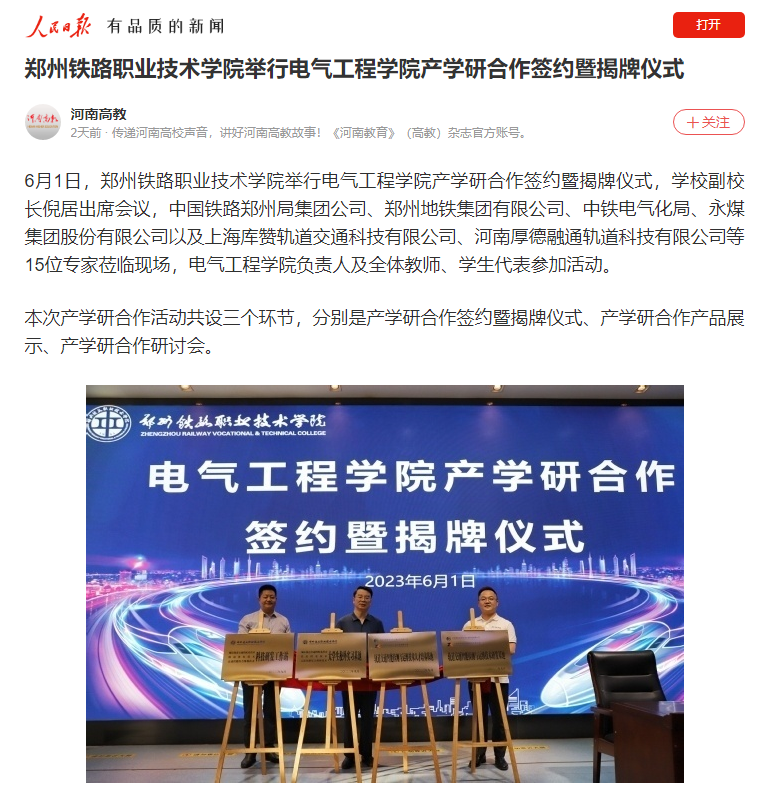 6月1日,beat365英国官方网站举行电气工程学院产学研合作签约暨揭牌仪式,学校副校长倪居出席会议,中国铁路郑州局集团公司、郑州地铁集团有限公司、中铁电气化局、永煤集团股份有限公司以及上海库赞轨道交通科技有限公司、河南厚德融通轨道科技有限公司等15位专家莅临现场,电气工程学院负责人及全体教师、学生代表参加活动。
