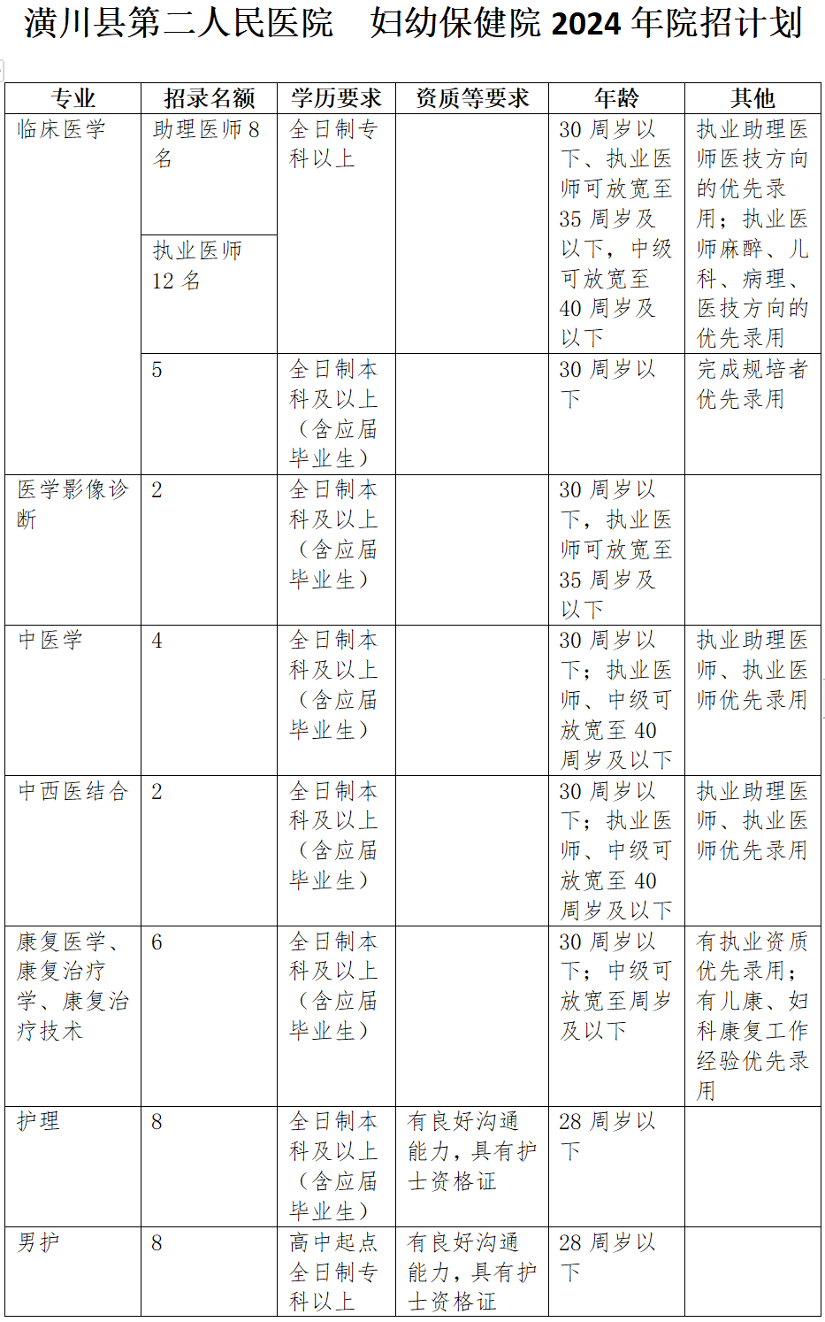 (二)专业、学历、资质、年龄等条件要求详见院招计划表