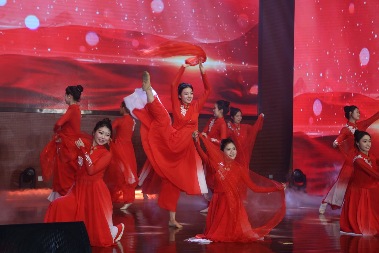 作为承载着几代人集体记忆的经典作品,《红旗颂》始终是红色文化与艺术表达的完美融合典范。此次演出中,刘奕、姜锦、裴娜三位教师将中原大地的豪迈气魄与红旗飘扬的壮志豪情融入肢体语言,以挺拔舒展的身姿模拟红旗舒展,用刚劲有力的动作再现峥嵘岁月,将革命浪漫主义精神与新时代奋进力量完美诠释。舞者们巧妙融合民族舞的灵动与现代舞的张力,手中红旗时而化作指引方向的战旗,时而变为象征胜利的图腾,在舞台上翻飞流转,营造出红旗漫卷的壮阔视觉效果。整支舞蹈既展现了舞蹈艺术的独特魅力,更传递了民进人与中国共产党同心同德、砥砺前行的坚定信念。