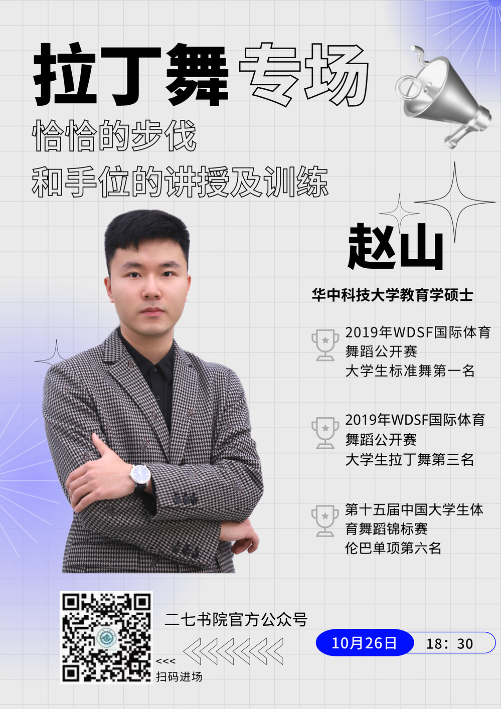 为丰富同学们校园文化生活,培养我院学生良好精神情操,郑州铁院二七书院将于10月26日晚六点半在微信公众号以线上直播形式开展第一期通识课堂“跟着山山老师学舞蹈”活动,届时同学们可以扫描二维码进入郑州铁院二七书院官方微信公众号观看直播。